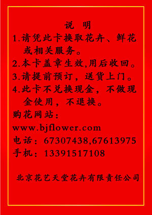 1.持卡人可凭卡换取等值的花卉、鲜花或相关服务,请在www.bjflower.com网站上挑选所需鲜花、花卉等,或请直接电话联系花艺天堂:67307438,67613975,手机:13901387705。